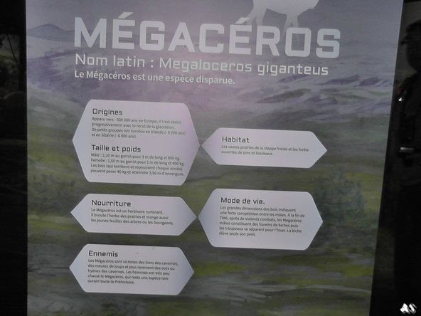 Le mégacéros, ou élan irlandais (!), est un animal relativement méconnu du grand public, qui peut le confondre par sa morphologie avec un cerf ou un daim... Mais dès que les dimensions de l’animal sont perçues, la confusion n’est plus possible : il est gigantesque ! L’envergure de ses bois et sa taille sont telles qu’il est impossible de ne pas le voir s’il est reconstitué dans un musée ou une galerie de préhistoire. Pour les mêmes raisons, cet animal ne pouvait pas passer inaperçu au Paléolithique, dominant une grand partie du reste de la faune.